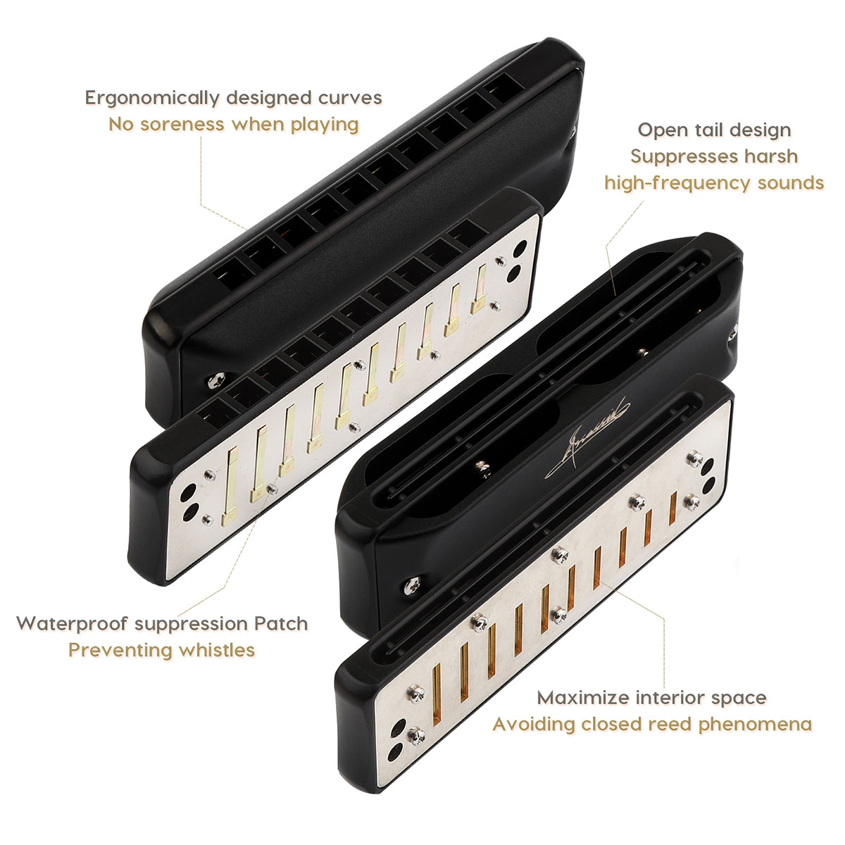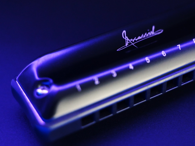 Нижняя часть гребёнки имеет уникальную форму с дополнительными отверстиями, которые призваны устранить лишние резонансы внутри гармоники и сделать её звук мягче.